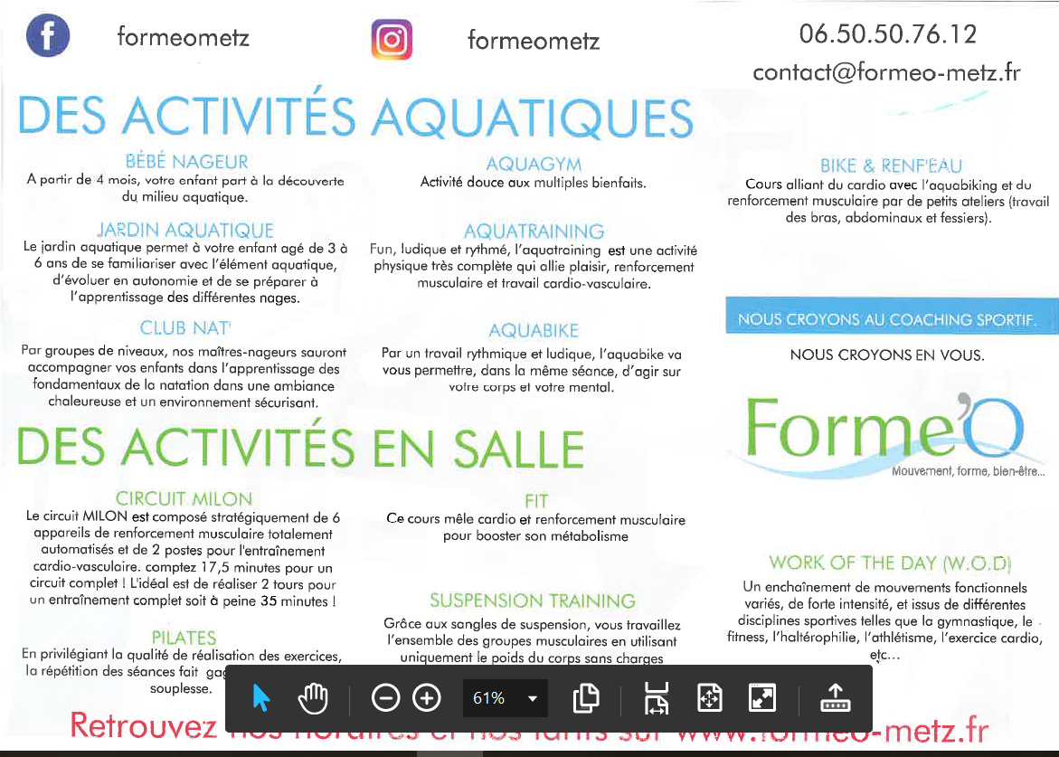 Pour toutes ces activités, renseignements : http://www.formeo-metz.fr/. Pour votre première séance il faut réserver sur place ou par téléphone ensuite on vous expliquera comment réserver en ligne simplement depuis le site Internet du club.